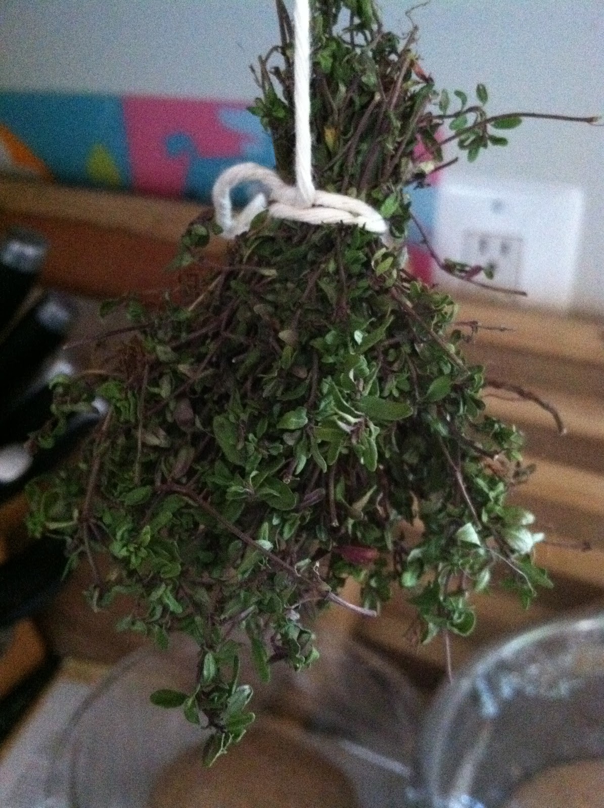 While you're waiting, here are some pictures of herbs from our garden that Mr. Bread Maiden has tied up and hung in our kitchen.